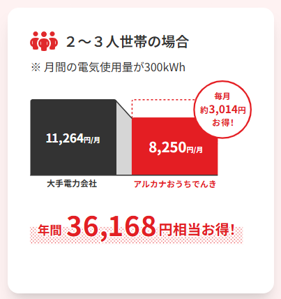 アルカナエナジーの最大の魅力は、従来の地域電力会社の従量電灯プランと比較して、基本料金や電力量料金が割安に設定されている点です。電力会社の運営に必要なコスト(店舗維持費や広告宣伝費など)を徹底的にカットすることで、その分を契約者の電気代へ直接還元しています。使用量が多いご家庭ほど、その節約効果を実感しやすくなります。